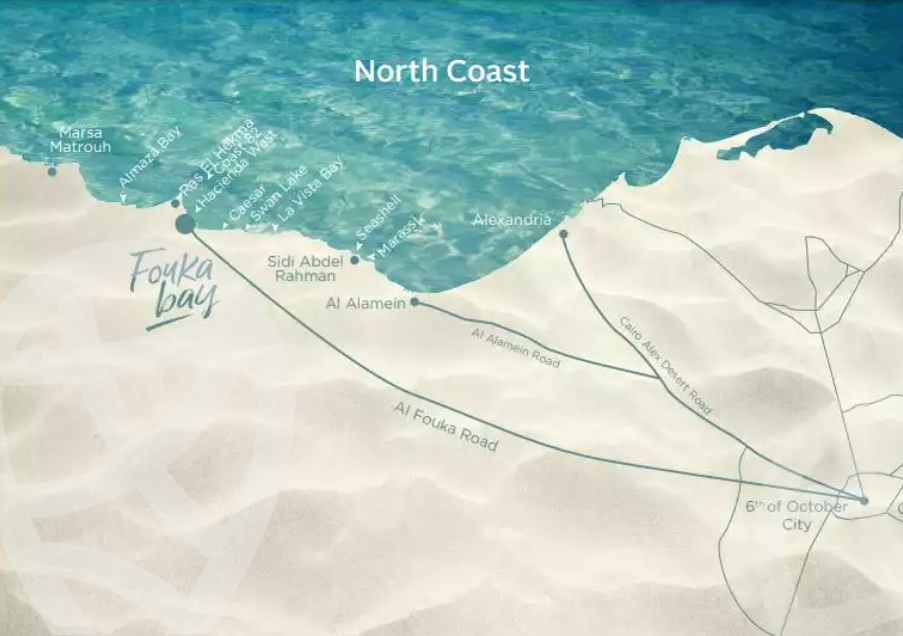 - يقع مشروع فوكا باي، تحديدًا عند الكيلو 211 على طريق الإسكندرية – مطروح الصحراوي.