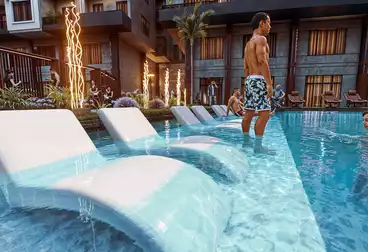 • 2 حمام سباحة بمستويات مختلفة.• نافورة مع مطعم ومقهى بجوار المسبح.• استقبال فندقي وغرف مكاتب لإدارة المنتجع.• خدمة تنظيف شاملة (غرف خارجية – سلالم – مداخل – استقبال).• خدمات الغرف حسب الطلب.• نظام مراقبة مع غرفة تحكم وكاميرات – أمن 24 ساعة.• مواقف سيارات بسعة 350 سيارة.• 10 مصاعد موزعة على المبنى.• إدارة احترافية للفندق والمطاعم والكافيهات.• مركز تسوق يضم علامات تجارية متنوعة.• هايبر ماركت بمساحة 2200 م².• صيدلية وخدمات تجارية متكاملة (كافيهات – مطاعم – محلات تجزئة).الأماكن القريبة• ممشى النزهة.• بيست واي – سوق الجملة – خير زمان.• محلات تجارية ومطاعم وكافيهات متنوعة.• مستشفيات وخدمات طبية.• بنوك ومنطقة خدمات مالية.• مواصلات عامة ومولات تجارية.