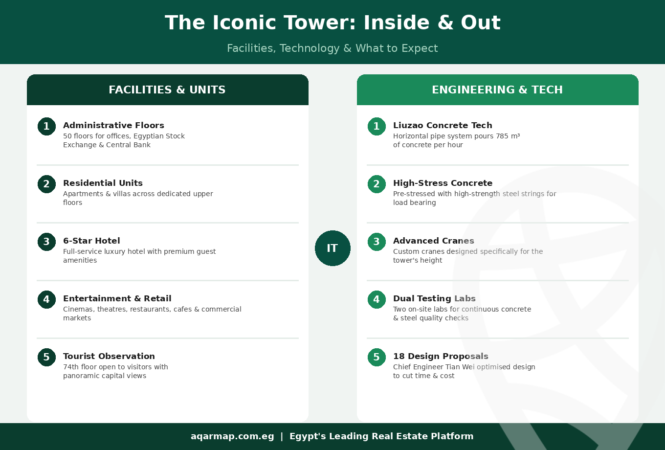 One of the most significant innovations used in constructing Iconic Tower Egypt is Liuzao technology — a system that transfers concrete through horizontal pipes and pumps rather than conventional vertical pouring methods. This approach reduced the degree of fluidity required in the concrete mix, cutting water consumption without causing drying or shrinkage. The result: a pouring rate of 785 cubic metres of concrete per hour, dramatically accelerating each floor’s completion cycle to just six continuous working days.