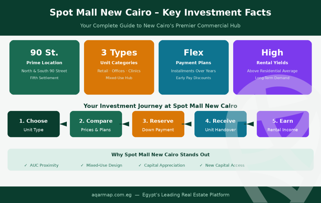 Whether you’re searching for a retail unit, clinic, office space, or a strong commercial investment opportunity, this comprehensive guide will help you understand everything about the Spot Mall New Cairo, including its location, developer, unit types, price range, and investment advantages.