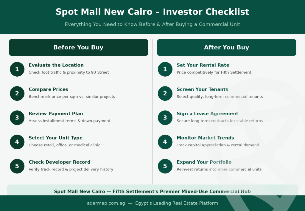 For investors evaluating commercial opportunities in Fifth Settlement, the Spot Mall New Cairo offers a strategic location, diversified unit options, strong demand drivers, and modern design standards. However, as with any investment, buyers should study market trends, compare similar projects, evaluate payment flexibility, and consider a long-term rental strategy before committing.